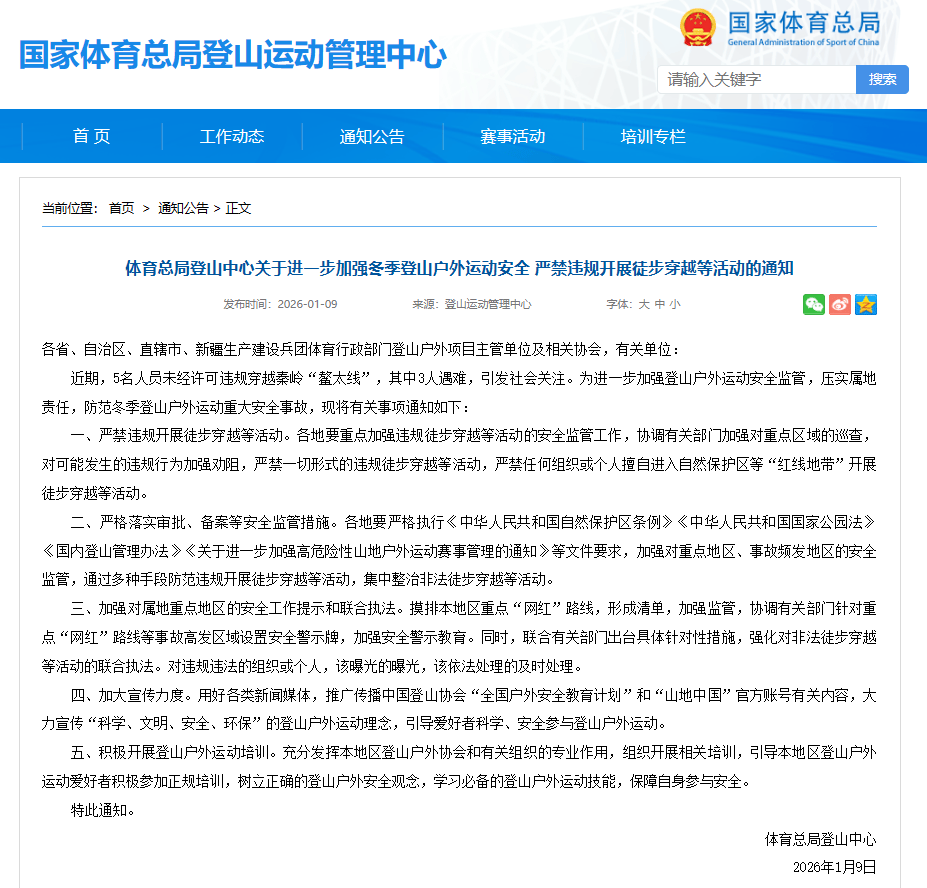 1月9日,国家体育总局登山运动管理中心发布通知,强调进一步加强冬季登山户外运动安全,严禁违规开展徒步穿越等活动。通知称,近期,5名人员未经许可违规穿越秦岭“鳌太线人遇难,引发社会关注。“各地要重点加强违规徒步穿越等活动的安全监管工作,协调有关部门加强对重点区域的巡查,对可能发生的违规行为加强劝阻,严禁一切形式的违规徒步穿越等活动,严禁任何组织或个人擅自进入自然保护区等‘红线地带’开展徒步穿越等活动。”“严格落实审批、备案等安全监管措施。”通知要求,各地要严格执行《中华人民共和国自然保护区条例》《中华人民共和国国家公园法》《国内登山管理办法》《关于进一步加强高危险性山地户外运动赛事管理的通知》等要求,加强对重点地区、事故频发地区的安全监管,通过多种手段防范违规开展徒步穿越等活动,集中整治非法徒步穿越等活动。通知指出,应加强对属地重点地区的安全工作提示和联合执法。“摸排本地区重点‘网红’路线,形成清单,加强监管,协调有关部门针对重点‘网红’路线等事故高发区域设置安全警示牌,加强安全警示教育。同时,联合有关部门出台具体针对性措施,强化对非法徒步穿越等活动的联合执法。对违规违法的组织或个人,该曝光的曝光,该依法处理的及时处理。”此外,通知还要求应加大宣传力度,积极开展登山户外运动培训。